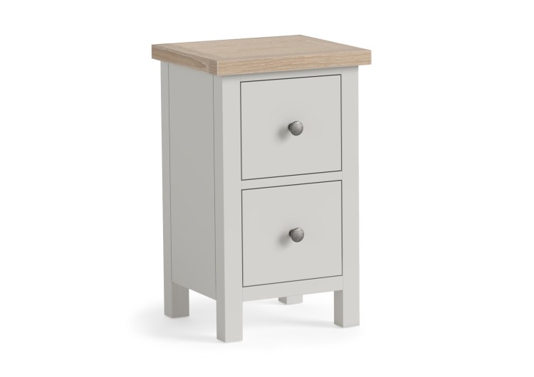 The Stamford 2 drawer bedroom chest is of an elegant slim design with clean contemporary lines. It has a hardwearing grey painted finish with a modern style white washed oak top. Its two spacious easy running drawers provide ample bedside storage. Sturdy block legs provide excellent stability. It comes with a choice of two elegant wooden or metal handle options and is delivered fully assembled.