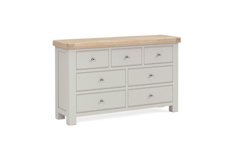 The Hexham bedroom furniture is painted in grey with chunky oak tops. It has smooth curved edges and the oak parts are finished in a durable white wash oil and includes dovetail joints for solid construction. Its seven spacious drawers provide ample bedroom storage. It comes with a choice of two elegant handles options and is delivered fully assembled.