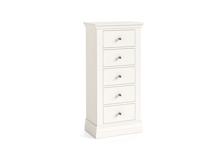 The Wilton 5 drawer white painted tallboy chest is an elegant design with an overhanging top cornice and stands on a sophicated chunky plinth base. The five drawers are all smooth running and easy to open providing ample bedside storage. it comes with a choice of two handles and is delivered fully assembled.