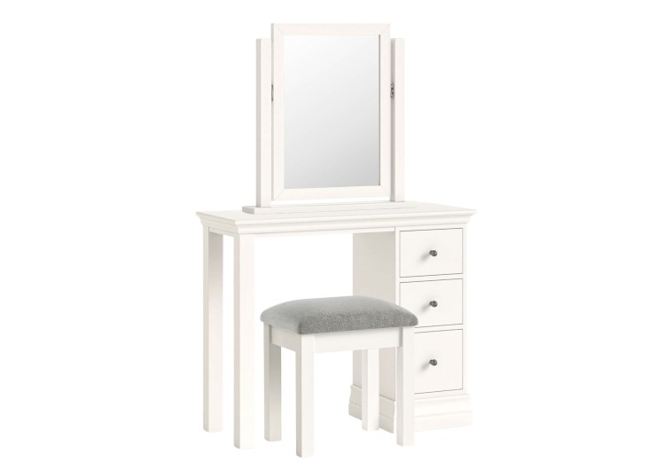 The Wilton single dressing table set is an elegant design with an overhanging top cornice and stands on a sophicated chunky plinth base. The dressing table itself has a hardwearing white painted finish. Its three spacious easy running drawers provide excellent storage space and it's two sturdy block legs excellent stability. The vanity mirror is finished in a matching white and the stool has a fabric seat.