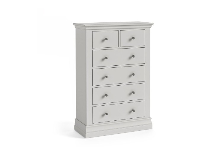 The Wilton 2 Over 4 drawer grey painted chest is an elegant design with an overhanging top cornice and stands on a sophicated chunky plinth base. The six drawers are all smooth running and easy to open providing ample bedroom storage. it comes with a choice of two handles and is delivered fully assembled.