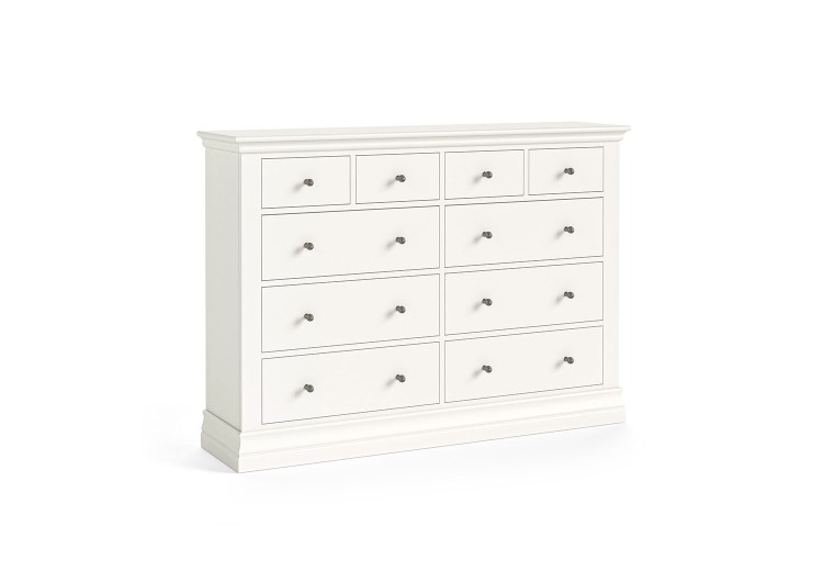The Wilton 4 Over 6 drawer white painted chest is an elegant design with an overhanging top cornice and stands on a sophicated chunky plinth base. The ten drawers are all smooth running and easy to open providing ample bedroom storage. it comes with a choice of two handles and is delivered fully assembled.
