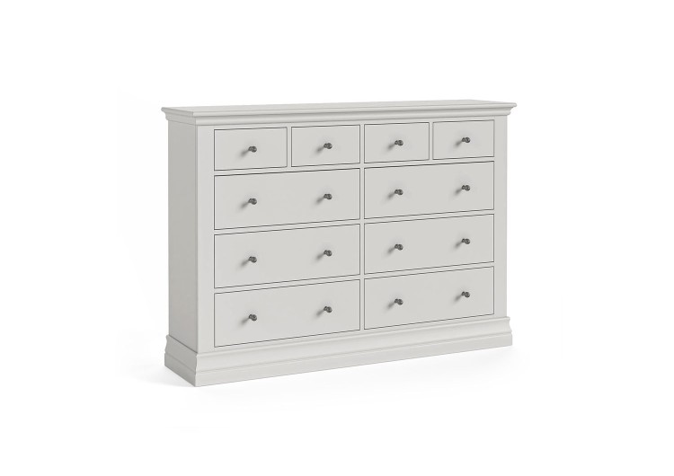 The Wilton 4 Over 6 drawer grey painted chest is an elegant design with an overhanging top cornice and stands on a sophicated chunky plinth base. The ten drawers are all smooth running and easy to open providing ample bedroom storage. it comes with a choice of two handles and is delivered fully assembled.